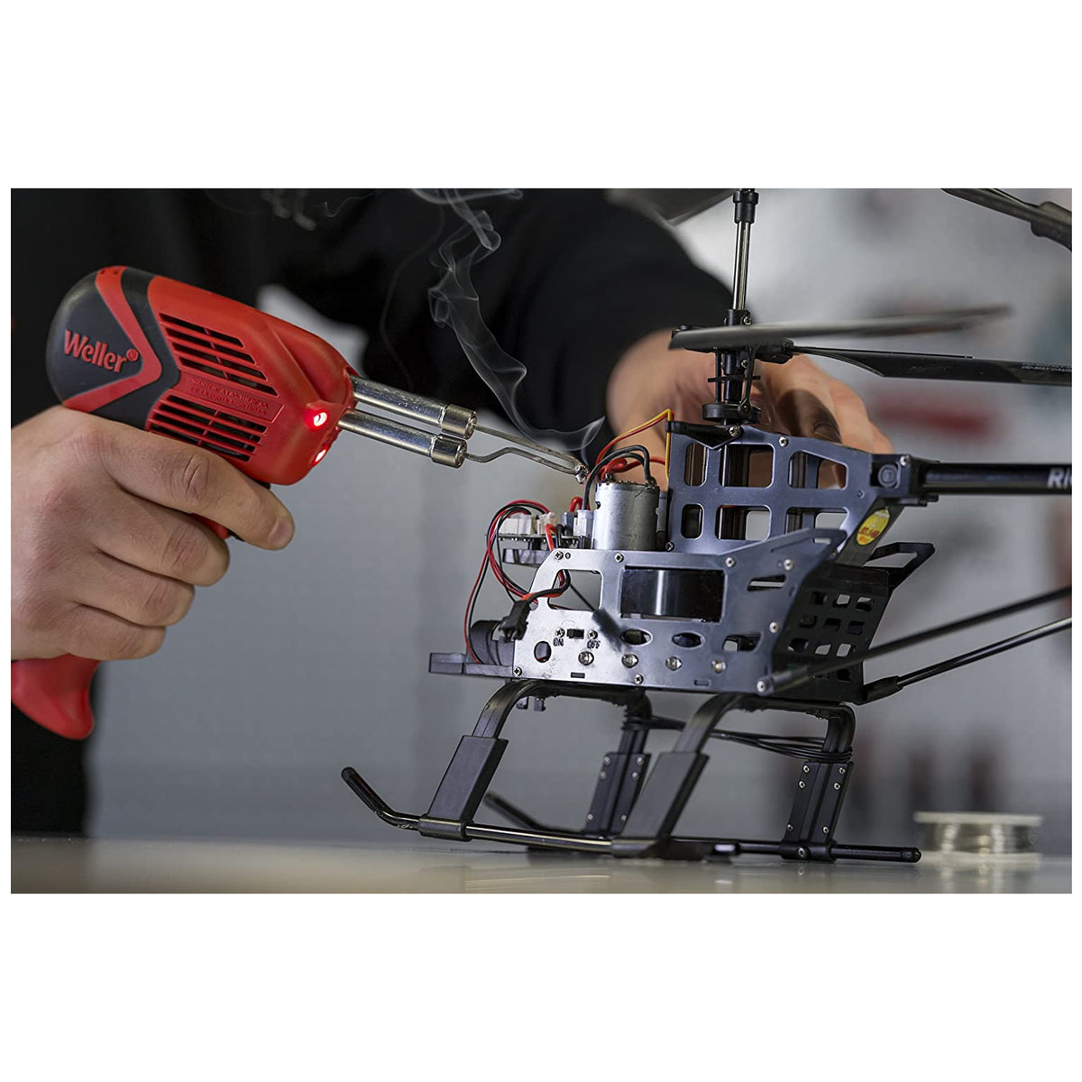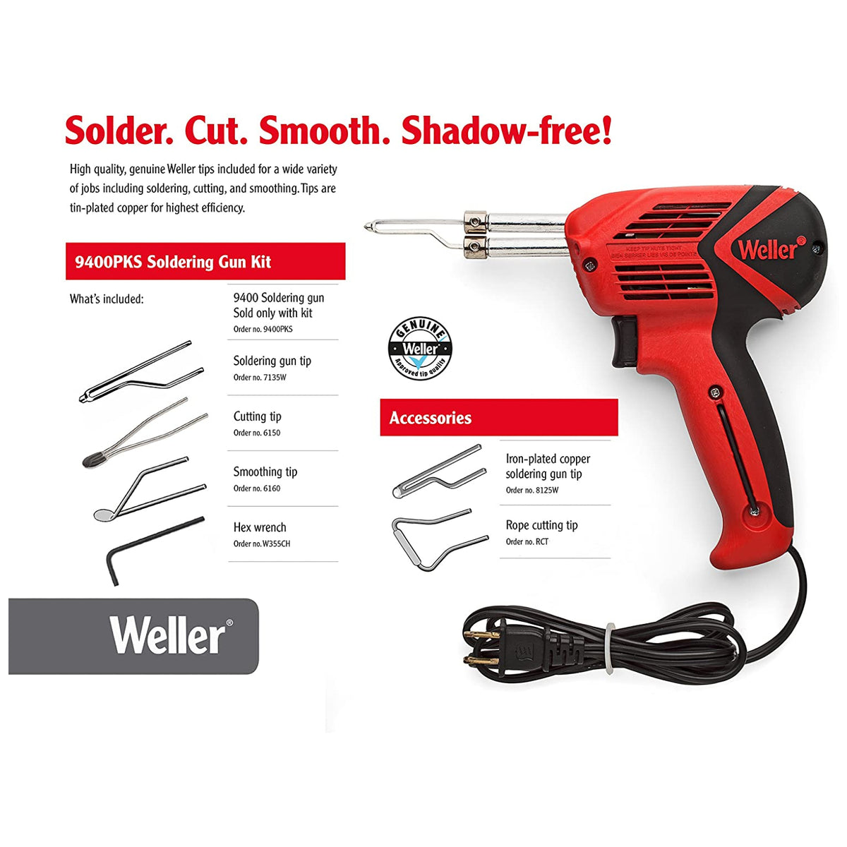 The Weller 100-Watt/140-Watt Soldering Gun Kit produces 100-Watt or 140-Watt heat and comes with 3 different tips for a wide variety of general soldering and hobby applications. Kit includes 9400 Soldering Gun, 3 Tips, Solder Wire, and Storage Case. 3 built in LEDs provide a spotlight on your project and help eliminate tip shadow. 6-Second heat up means your tip is ready for solder almost immediately. The co-molded perfect fit pistol grip features a soft, non-slip grip and ergonomic comfort.